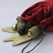 Red/black silk shantung and red/black organza flower with beaded center and bud with wrapped stem, coq feathers, split turned leaves and two beaded negative leaves, various ribbon fillers, olive pearl and a caterpillar under mousseline skirt.